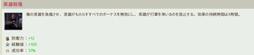 英雄の殺傷は隻狼の役割だ。敵陣へと前かがみに忍び寄る姿がMOEの中では映し出される。成功率は通常31%だが、装備を変えて50%以上に増強してある。英雄の有無は戦闘の際におそらく倍以上の違いを生み出す。その恐怖は、甚大なものでほぼすべてのユーザーが英雄を暗殺されると、攻撃に出ることができない。面白いものだ。3時間は足止めを食らうことになる。たった一人の優秀なスパイの成功によってだ。先日スパイクラスのレベルがようやく2になった。まだまだ糊代はある。最強のスパイを育ててみるのも良いのではないだろうか。