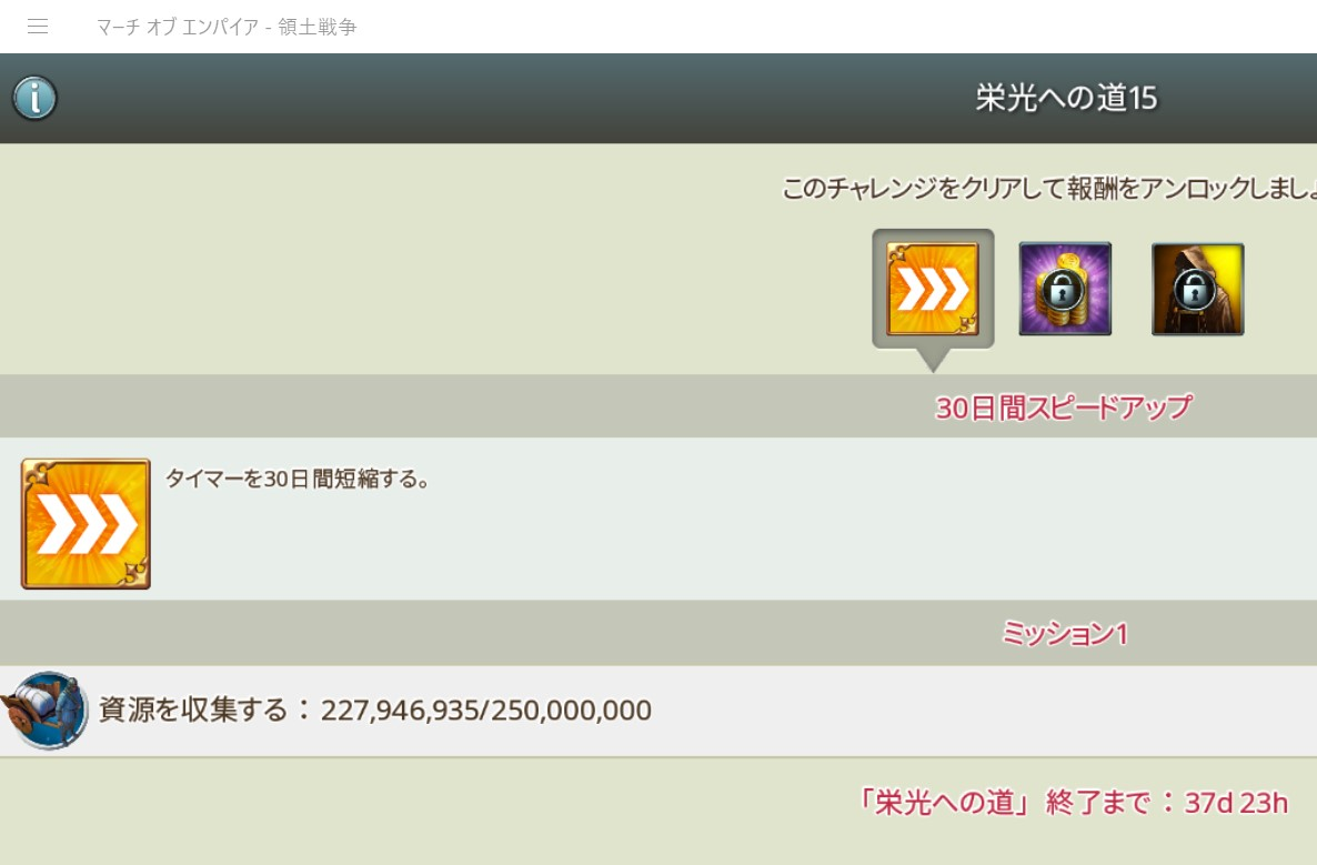 - 栄光への道6 クリアまでの残り時間:15d ミッション1/エンカウンターで勝利する:0/25 報酬1/エンカウンター攻撃ブースト(24時間+200%) ミッション2/資源を取引する:0/3,000,000 報酬2/収集速度100%ブースト(8時間+100%) ミッション3/ロイヤルロトをプレイする:0/1 報酬3/24時間スピードアップ ミッション4/城を強化:25/27 報酬4/レニウムの鎧(建設+30%、研究+20%、訓練+15%) -- Mustain?