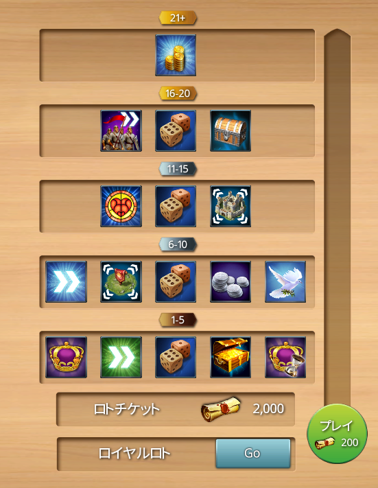 - 16-20 ロイヤルロトチケット70枚、再度振り直し、宝箱チャレンジ