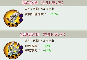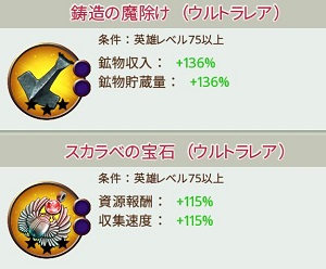 弓、馬、槍、歩兵など種類ごとの戦力の増加、行軍や収集、研究の速度などお馴染みの能力値の大幅な増加がある。(2),(3),(5)など1が無い値がふられているが、数字が大きいほど増加能力が高い。これはセットアイテムのなかでどれだけを装備しているかというアイテムの「数」で間違いないだろう。ほとんどがウルトラレアアイテムだが、「パラディンの武具」「宿主の武具」だけはスーパーレアが対象になっている。