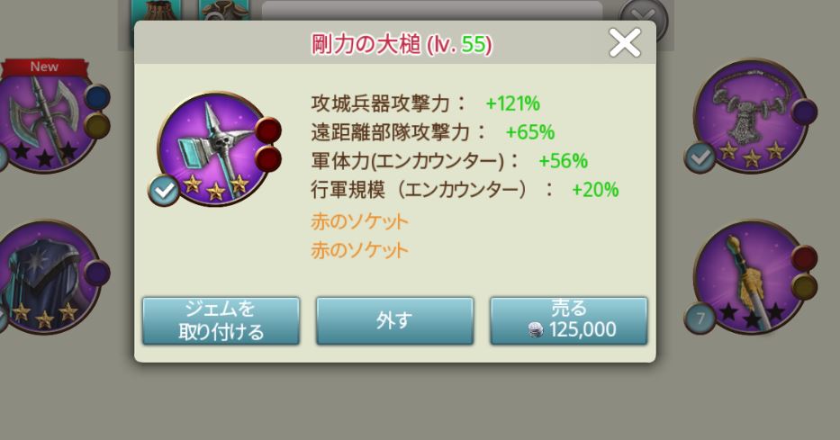 各部隊ごとの攻撃力や体力、エンカウンターやPVP(対プレイヤー)用途、密偵に資源の増加など数百はあるであろうMOEの武器。金貨を払ってくじを引くロトでも多くのアイテムをゲットできるがノーブルロトにおいて過去最高との呼び声もある武器「剛力の大槌」が出現した。攻城兵器攻撃力+106%、遠距離攻撃力+57%、軍体力(エンカウンター)+49%、行軍規模(エンカウンター)+17%。強化を最高にするとそれぞれ121%、65%、56%、20%まで上がる。