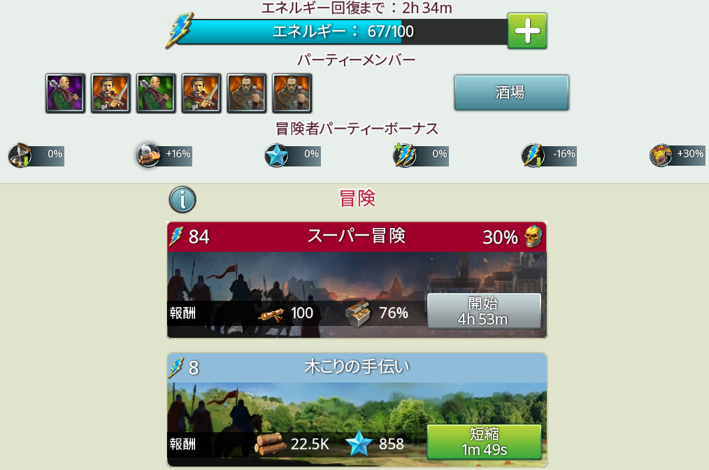 酒場のレベルが高くなると、冒険に参加できる冒険者の数が増えます。